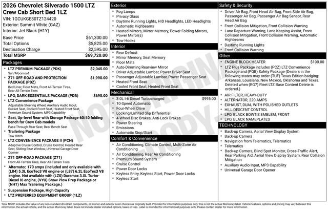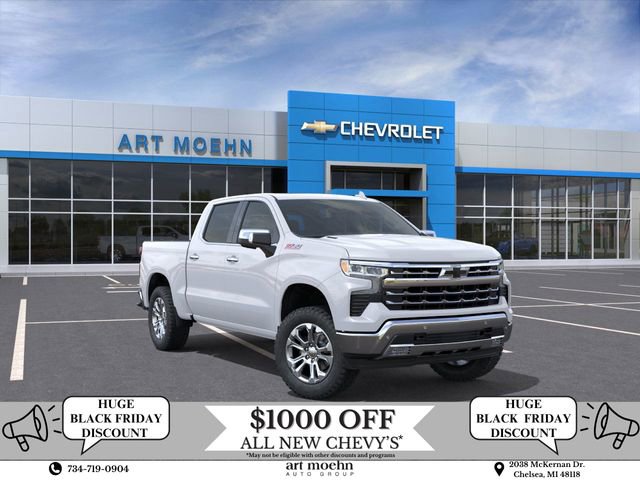Summit White 2026 Chevrolet Silverado 1500 LTZ Apple Car Play/ Android Auto, I-94 EXIT 159, 10-Speed Automatic, 4WD, Black Leather. Internet Price includes GM Employee discount, and the following rebates, which only apply to a purchase (lease incentives may be different). Certain individuals may not qualify, see dealer for details:$1500 - Chevrolet Consumer Cash Program. Exp. 12/01/2025 $1750 - GM Bonus Cash. Exp. 12/01/2025