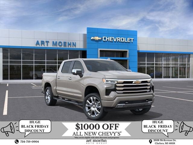 White 2026 Chevrolet Silverado 1500 High Country Apple Car Play/ Android Auto, I-94 EXIT 159, 10-Speed Automatic, 4WD, Black Leather. $10,312 off MSRP! Internet Price includes GM Employee discount, and the following rebates, which only apply to a purchase (lease incentives may be different). Certain individuals may not qualify, see dealer for details:$1500 - Chevrolet Consumer Cash Program. Exp. 12/01/2025 $1750 - GM Bonus Cash. Exp. 12/01/2025