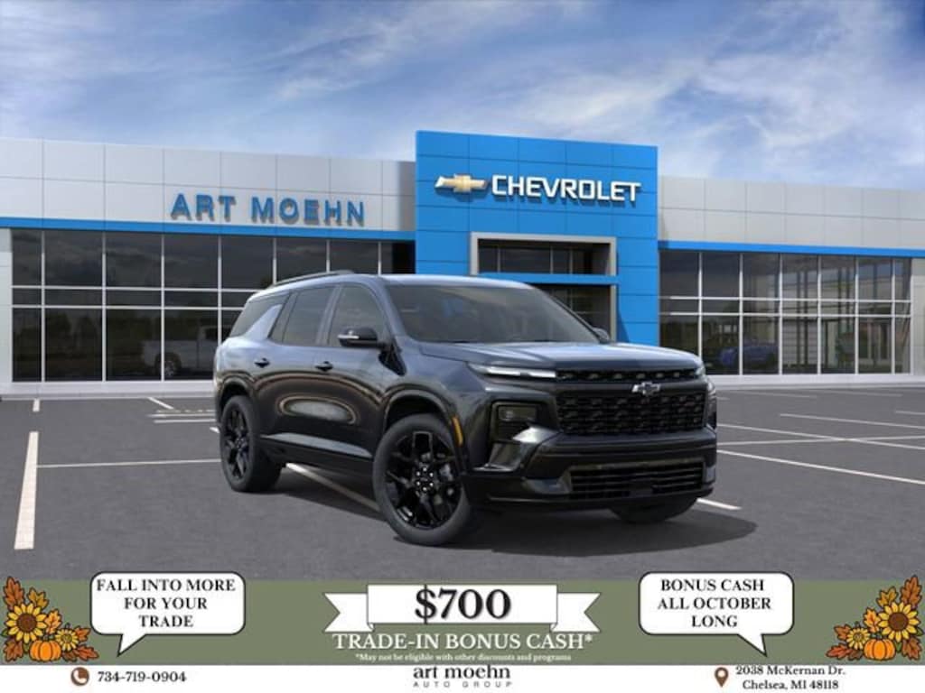 Black Metallic 2026 Chevrolet Traverse RS Apple Car Play/ Android Auto, I-94 EXIT 159, AWD, 1st & 2nd Row All-Weather Floor Liners (LPO), 3rd Row All-Weather Floor Liner (LPO), Floor Liner Package (LPO), Integrated Cargo Liner (LPO), Preferred Equipment Group 2RS. $4,584 off MSRP!